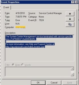 SCOM 2007 R2 : The System Center Management service terminated with service-specific error 2147500037 (0x80004005).