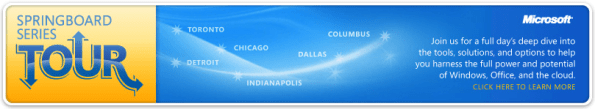 The Springboard Series Tour is back! This 6 city tour brings the top product teams from Microsoft to you. We understand the questions and issues that IT pros deal with every day. How do I manage end users bringing consumer devices into the office? Should we look to the cloud for key solutions? Should I virtualize? What are the best tools to manage application compatibility and deployment? The Springboard Series Tour brings the experts and the answers.