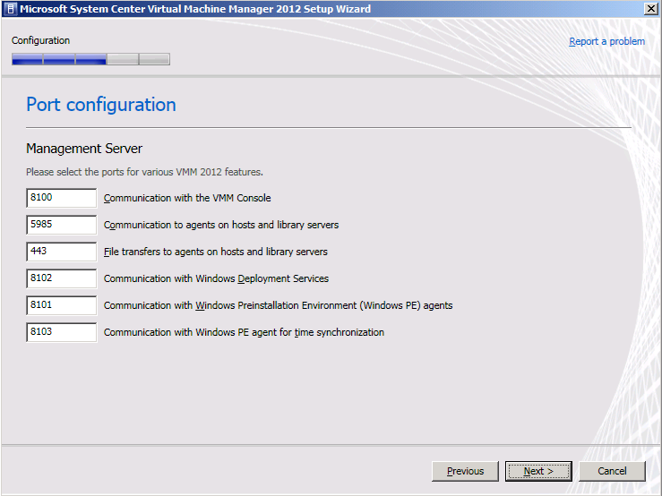 Note: When you install the VMM management server you can assign some of the ports that it will use for communications and file transfers between the VMM components.