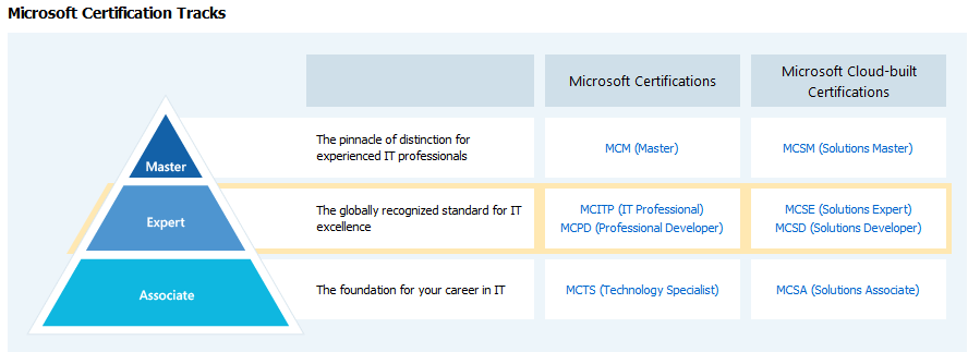 - The Expert Level comprises the Microsoft Certified Solutions Expert (MCSE) or its developer equivalent, Microsoft Certified Solutions Developer (MCSD), and is Microsoft’s flagship certification for individuals who want to lead their organization’s transition to the cloud. These certifications recognize IT professionals and developers with broad and deep skill sets across Microsoft solutions.