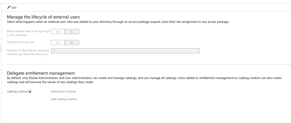 Note: Entitlement management reaquires Azure AD Premium P2 or Enterprise Mobility + Security (EMS) E5.