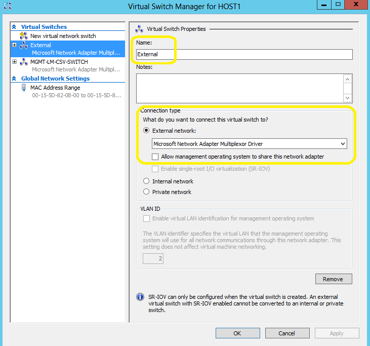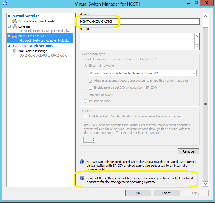 And let’s have a look in the Hyper-V Manager Console, on the properties of the Virtual Switch’s: