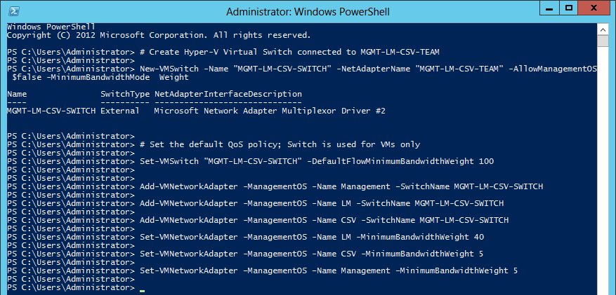 New-VMSwitch -Name “MGMT-LM-CSV-SWITCH” -NetAdapterName “MGMT-LM-CSV-TEAM” -AllowManagementOS 0 -MinimumBandwidthMode Weight