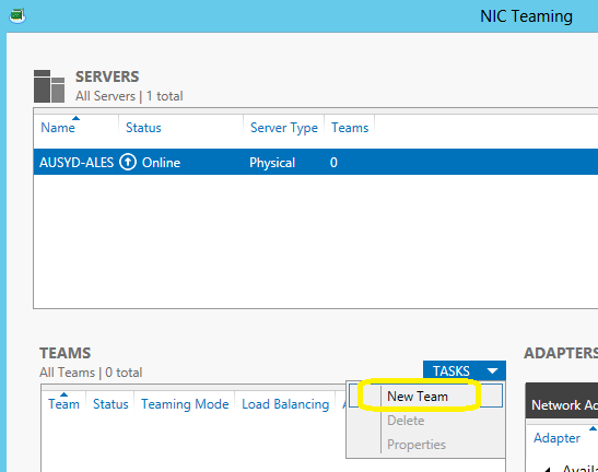 - Click on Nic Teaming. Click on Task and then click on NEW TEAM