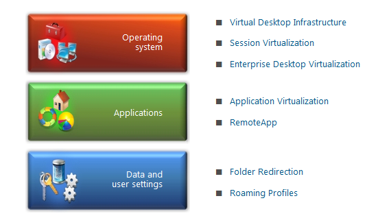 Data and User Settings: Utilizes folder redirection and roaming profiles to enable you to make the user’s personal profile and data available dynamically on any authorized PC, and to back up personal profiles and data to the datacenter. http://technet.microsoft.com/library/cc732275.aspx